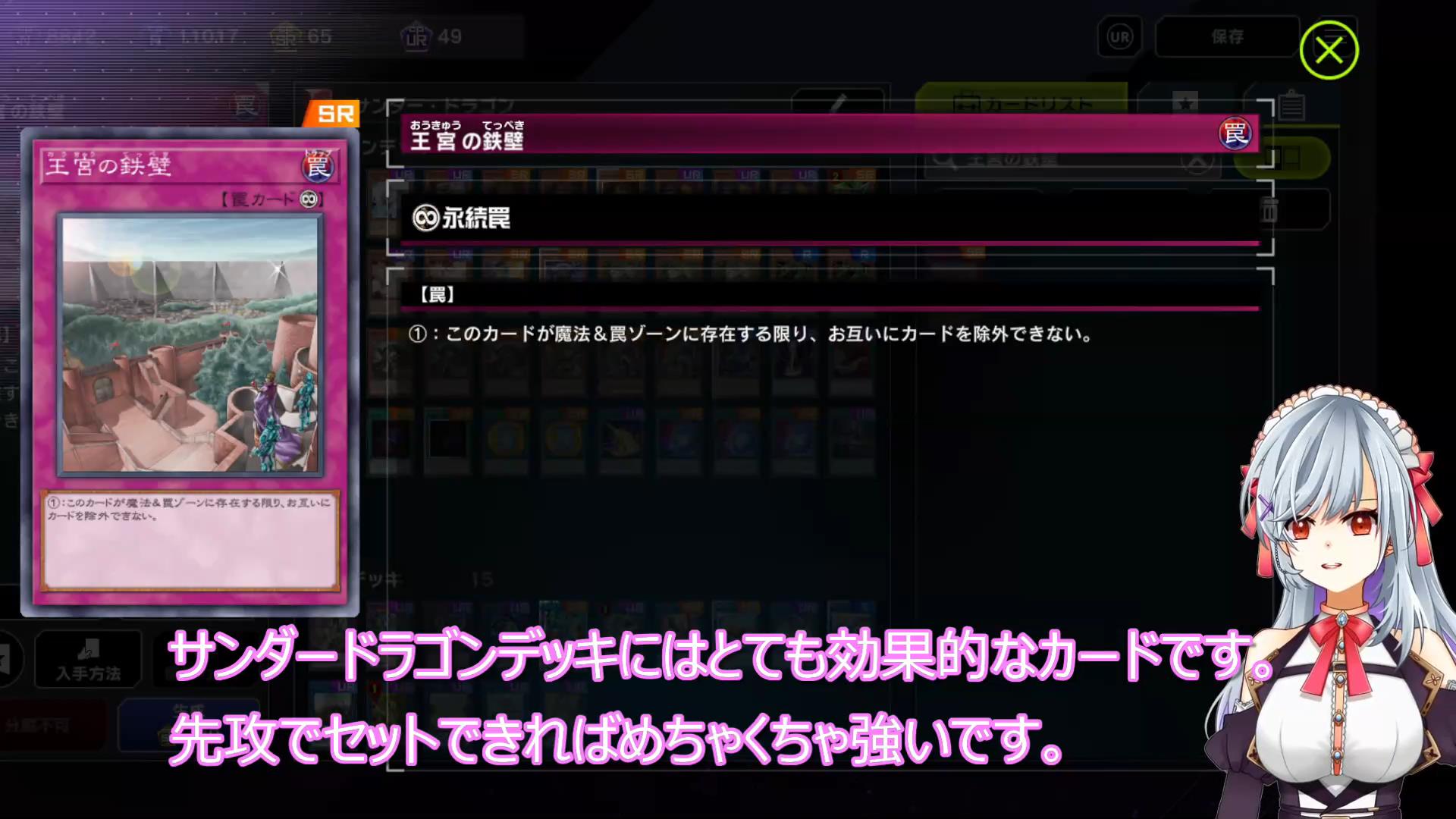 王宮の鉄壁はお互いにカードを除外できなくなるという永続トラップカードで、除外が展開に必須であるサンダードラゴンデッキにはとても効果的なカードです。先攻でセットできればめちゃくちゃ強いです。